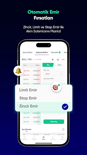 Gelişmiş Alım Satım Araçları: Piyasa hareketlerini takip edin, zincir emir ve fiyat alarmları ile kripto para alım satımlarınızı daha etkin yönetin.