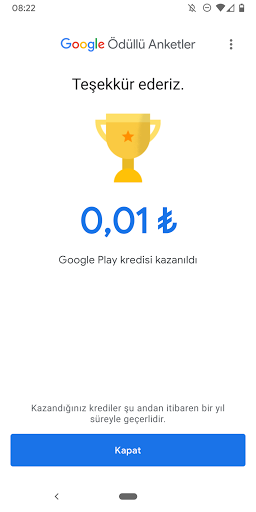 Google Surveys tarafından geliştirilmiş bir uygulama olan Google Ödüllü Anketler ile kısa anket sorularını yanıtlayarak Google Play kredisi kazanın.