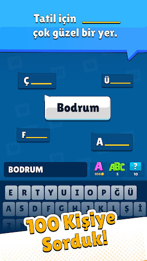 Aileler yarışıyor yarışmasını sevdiyseniz bu oyun tam size göre. Çoğu kişinin, günlük hayattan sorulara ne cevap verdiğini tahmin etmeniz gerekiyor. Her seviyede, bir boşluk doldurma sorusuna, en popüler beş cevabı arıyoruz. Yaygın cevapların baş harfleri ipucu olarak gösterilirken, kelimelerin uzunluğuna göre gösterilen cevaplar ve klavyede ki sınırlı harfler yanıtı kolayca bulmanızı sağlıyor.